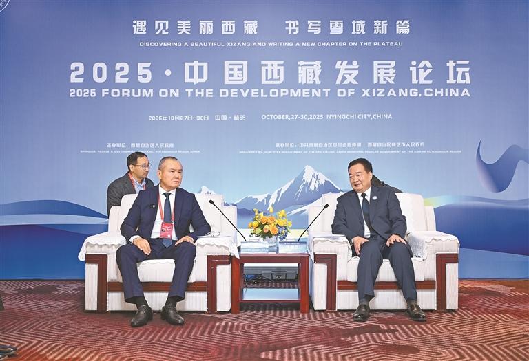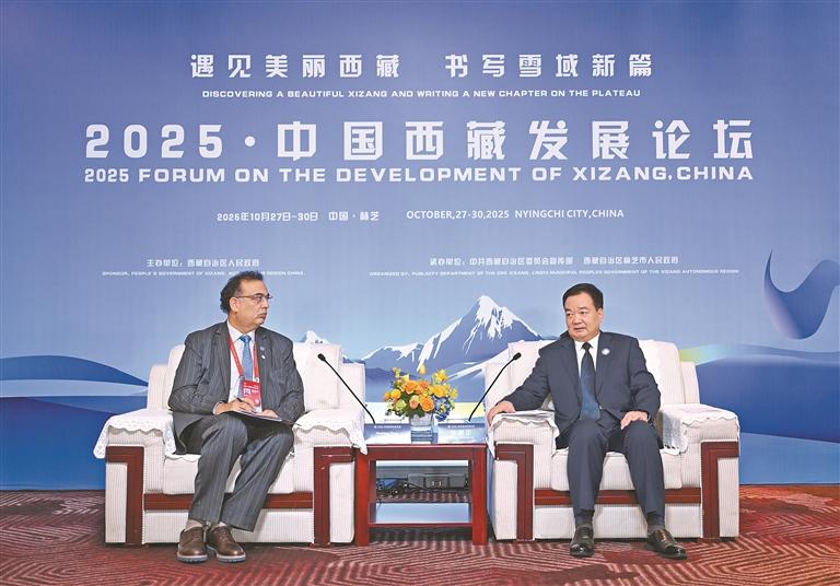 10月28日,自治区党委书记王君正在林芝会见参加2025·中国西藏发展论坛的外国政要和驻华使节。这是王君正会见联合国秘书长古特雷斯先生的代表,联合国教科文组织驻华代表、东亚办事处主任兼代表夏泽翰。本报记者 旦增西旦 摄