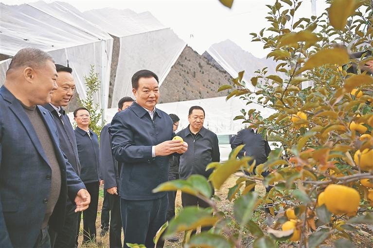 10月29日至30日,自治区党委书记王君正深入林芝市、山南市,进机关、访农户、入厂房、看项目,宣讲党的二十届四中全会精神,调研推动经济社会发展各项工作。这是王君正在林芝市朗县洞嘎镇巴基塘详细了解高标准苹果种植情况。本报记者 旦增西旦 摄