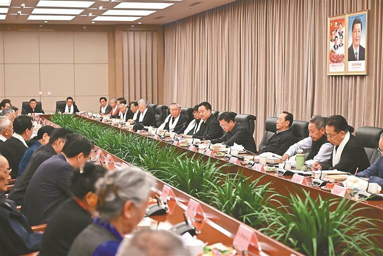 春节、藏历新年即将到来之际,自治区党委书记王君正分别在成都、拉萨看望慰问老领导老同志。这是王君正与离退休干部座谈,通报全区经济社会发展情况。本报记者 旦增西旦 摄